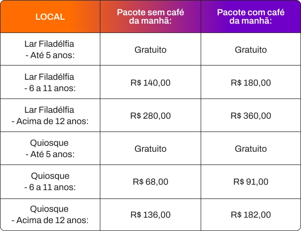 – Caso a sua família realize a reserva de hospedagem no Lar Filadélfia, o preço inclui pensão completa com todas as refeições e não é necessário realizar nova reserva de alimentação na inscrição.